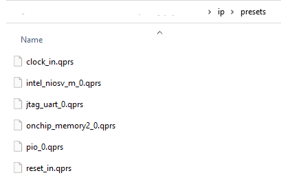 After you create system presets using System Preset Generation, each of the presets for each of the IP in the Platform Designer system save into different .qprs files to ensure easier modification (if needed) for preset .qprs files. For better organization, you can create a specific folder for presets only, as the following example shows.