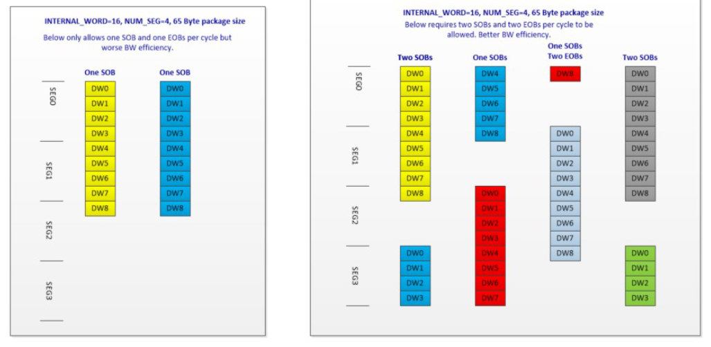 As shown in the figure below, the bandwidth efficiency of the four-segment case is significantly better than the single-segment case. Each segment supports both Interleaved and Packet transfer modes when you operate the IP in multi-segment mode.