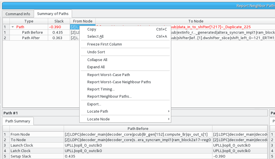 Report Neighbor Paths reports the most timing-critical paths in the design, including associated slack, additional path summary information, and path bounding boxes. Report Neighbor Paths shows the most timing-critical Path Before and Path After each critical Path. You can optionally view multiple before and after paths. Retiming or logic balancing of the Path can simplify timing closure if there is negative slack on the Path, but positive slack on the Path Before or Path After.