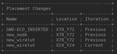 Alternatively, you can view this data in the generated fit.eco file. The Compiler organizes the report output according to the category of ECO change, such as Placement Changes. The table specifies the "Changes in Previous ECO Runs" and "Changes in Current ECO Run".