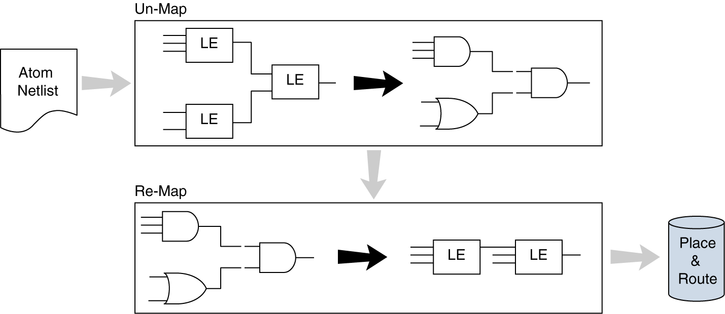 The Perform WYSIWYG primitive resynthesis option directs the Quartus® Prime software to un-map the logic elements (LEs) in an atom netlist to logic gates, and then re-map the gates back to Intel-specific primitives. Third-party synthesis tools generate either an .edf or .vqm atom netlist file using Intel-specific primitives. When you turn on the Perform WYSIWYG primitive resynthesis option, the Quartus® Prime software uses device-specific techniques during the re-mapping process. This feature re-maps the design using the Optimization Technique specified for your project (Speed, Area, or Balanced).