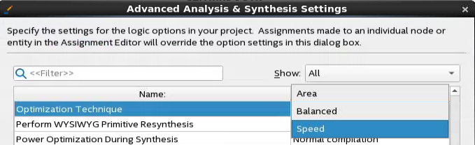 - On the Assignments menu, click Settings. In the Category list, click Compiler Settings > Advanced Settings (Synthesis). For Optimization Technique, select Speed.