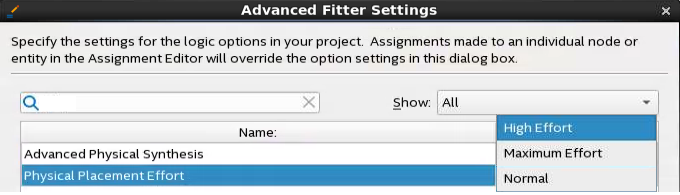 - On the Assignments menu, click Settings. In the Category list, click Compiler Settings > Advanced Settings (Fitter). For Physical Placement Effort, select High Effort or Maximum Effort. The High and Maximum effort settings take additional compilation time to further optimize placement.