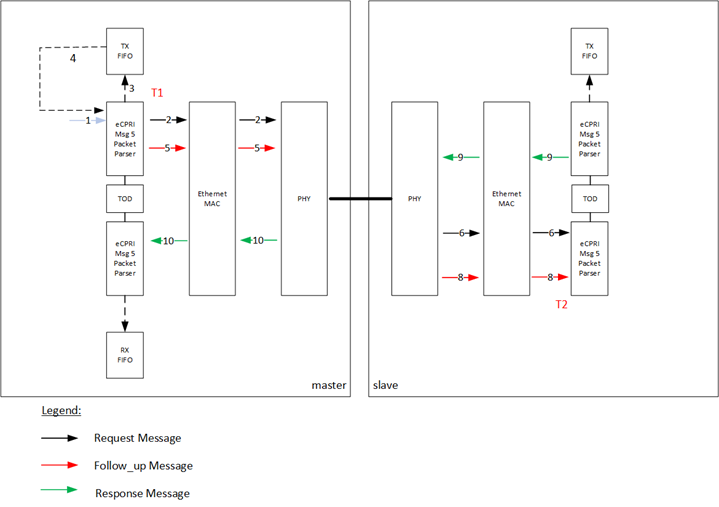 - After decoding the eCPRI packet, the packet parser sends a Response packet containing timestamp T2 and the calculated compensation value CV2 to the MAC block.