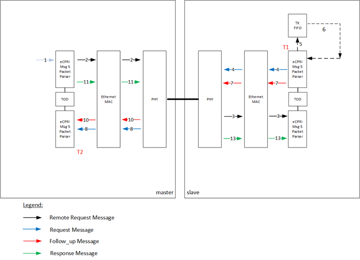 - The CPU program sets the measurement ID, remote request, and start bits in the eCPRI message 5 control register to initiate the one-way delay measurement process.