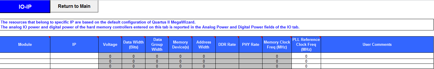 Analog I/O power and digital power of hard memory controllers and HPS IPs entered on this tab are reported in the Analog Power and Digital Power fields of the I/O worksheet. If the IP uses other resource types (for example Logic or PLL), the power is reported on the corresponding worksheet.