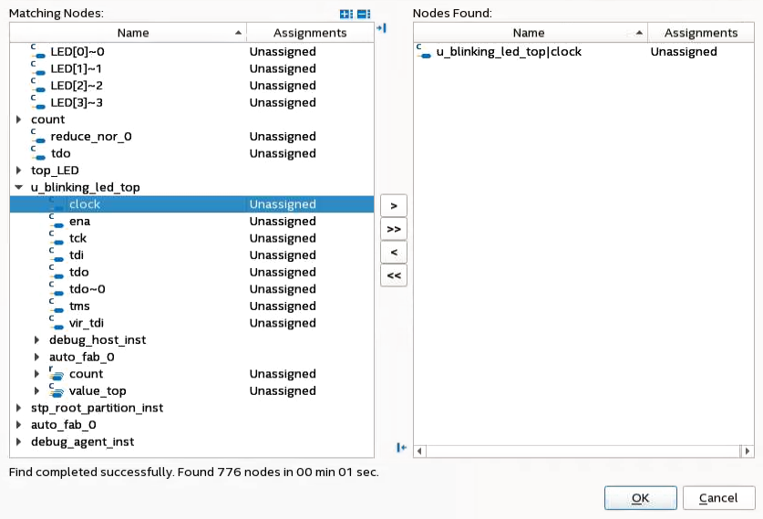 - In the Node Finder, search for *, and select the clock node in the reserved core partition u_blinking_led_top. Click >, and then click OK to close.