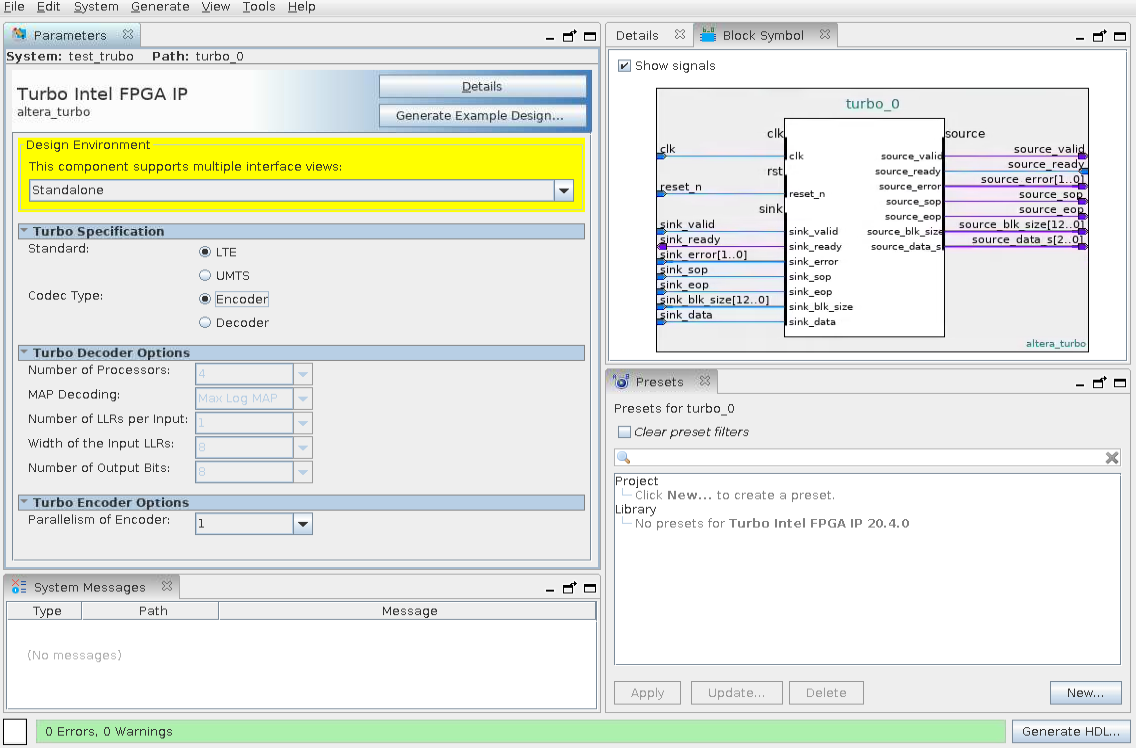 - Set the parameter values in the parameter editor and view the block diagram for the component. The System Messages tab at the bottom displays any errors in IP parameters:
