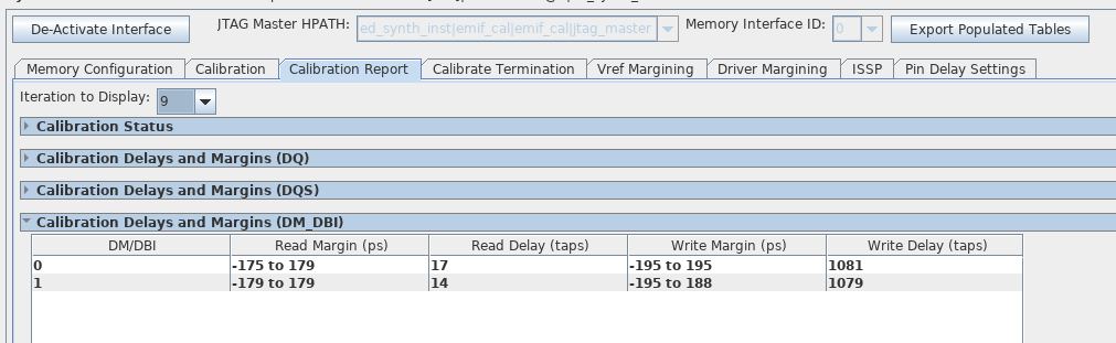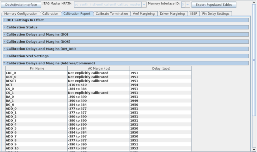 The Calibration Delays and Margins reports provide detailed information about the margins observed during calibration, and the settings applied on the calibration bus during calibration. To view the margins, click on the respective section for DQ, DQS, DM_DBI, VREF or Address and Command.