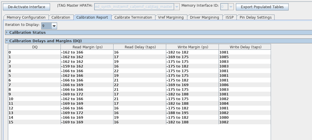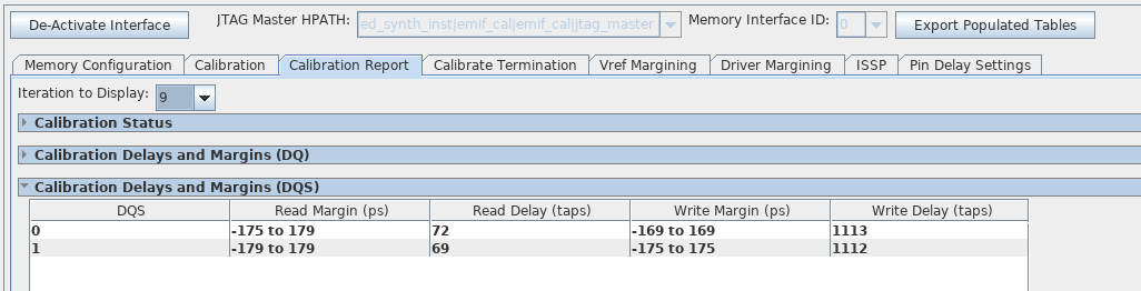 The Calibration Status report shows the calibration status and memory parity (ALERT_N) status. If a failure occurs, this report shows the first stage of calibration that failed, as well as which data groups failed this stage. Memory parity status observed during calibration is shown for DDR4 interfaces if you have enabled ISSPs in the design. The calibration status report window includes a memory parity status LED and a button that allows you to reread the memory parity status.