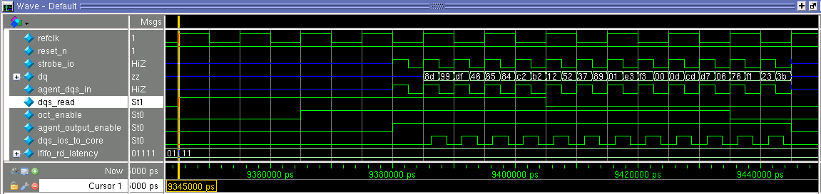 DQS read is initiated by the DQS driver when dqs_read is asserted at 9.345 ms. The lfifo_rdata_en_full (dqs_read) of the ALTDQ_DQS2 IP core is also asserted for the entire length of the desired read burst, which in this case is 12 full-rate cycles. As the DQS agent receive the read command, it is then ready to sends out data as per requested. This is shown with agent_output_enable being asserted from 9.380 ms to 9.445 ms. During this period, the DQS agent drives the strobe and data lines of the external memory interface. In this test bench, strobe_io is driven by dqs_agent_to_ios. When output enable is deasserted, strobe_io will be set to Hi-Z.