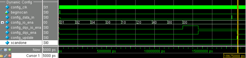 The following figure shows the waveform for the dynamic configuration simulation generated after executing topwave.do, in between the high pulses of beginscan and scandone. There is a pulse between 18.035 ms and 18.075 ms on the config_data_in signal. This is because the dqsinputphasesetting of the DQS configuration is set to 2'b01 in the testbench.