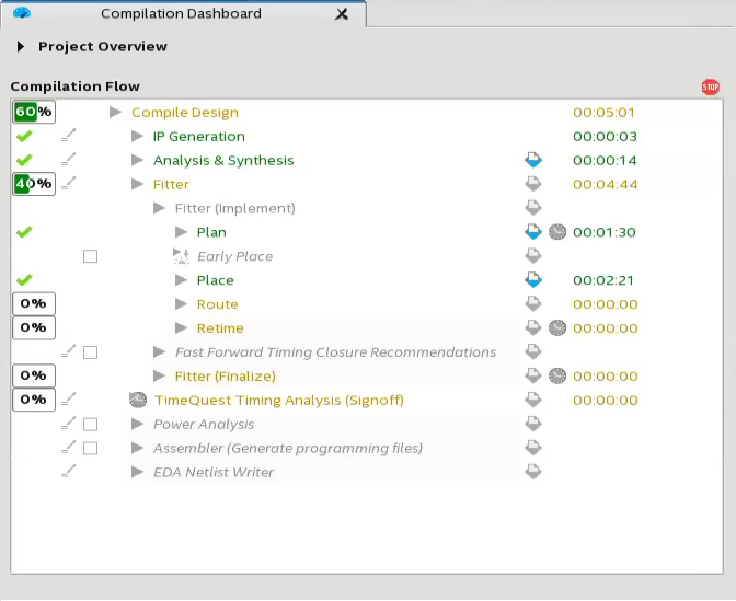 Intel® Quartus® Prime Pro Edition displays the compilation stages and progress in the Compilation Dashboard.