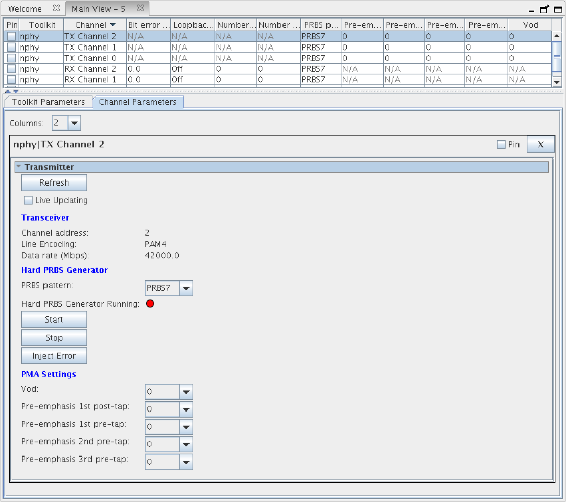 You can also use the Status Table to select which channel to display in the Parameters Pane. The channels you select in the Status Table are shown in the Parameters Pane. You can use the Pin setting for a channel to display the channel, regardless of the current selection in the Status Table.