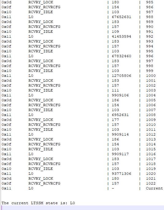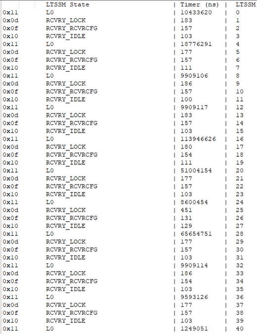 When you want to dump the LTSSM sequence, a single read of the FIFO status of the respective core is performed. Depending on the empty status and how many entries are in the FIFO, successive reads are executed.