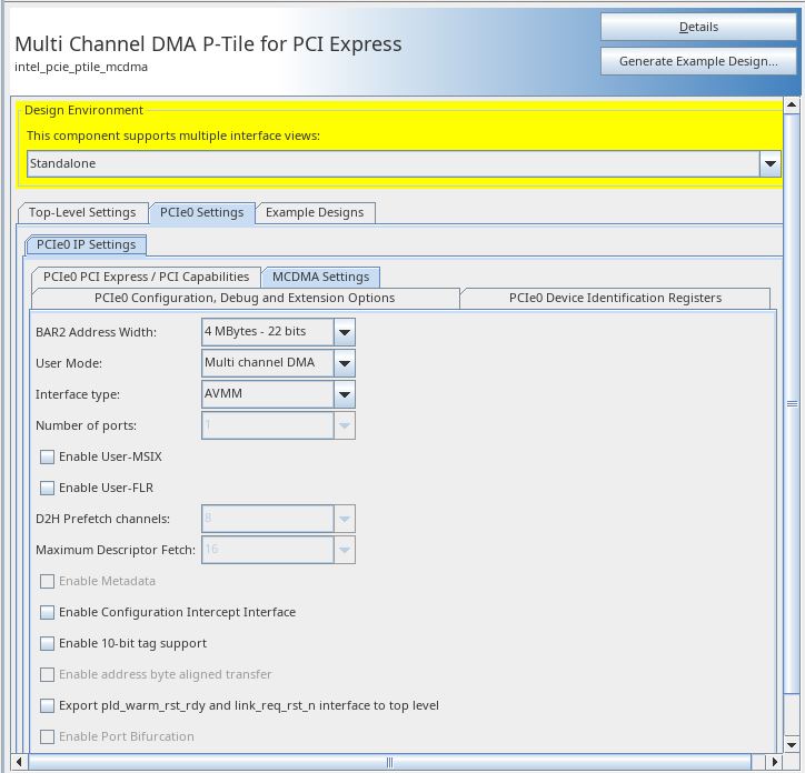 This option allows user to configure the mode of operation for MCDMA IP. MCDMA mode has the DMA functionality. BAM and BAS offer Bursting Master and Slave AVMM capabilities without DMA functionality
