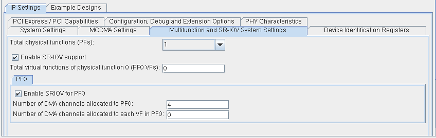 | Number of DMA channels allocated to PF0 | 0 - 512 | Number of DMA Channels between the host and device PF Avalon-ST / Avalon-MM ports. |