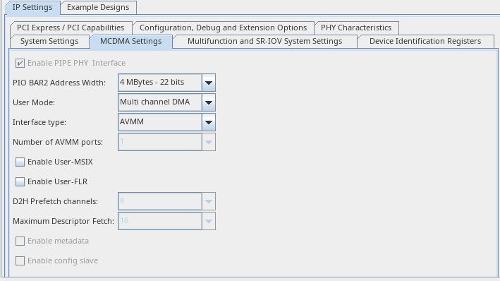 This option allows user to configure the mode of operation for MCDMA IP. MCDMA mode has the DMA functionality. BAM and BAS offer Bursting Master and Slave AVMM capabilities without DMA functionality