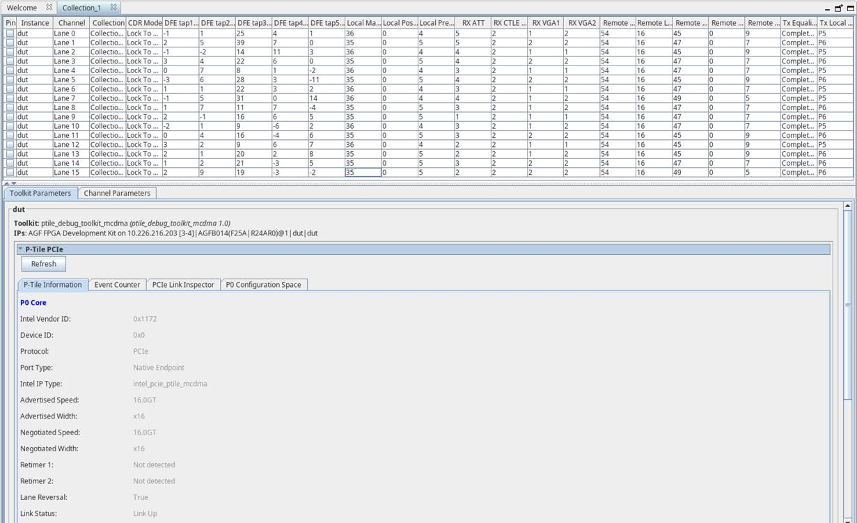 - Select the DUT with the Debug Toolkit you want to view. This will open the Debug Toolkit instance of that DUT in the Details window. An example of P-Tile Debug Toolkit is shown in the following figure.