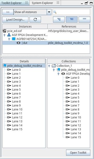 - The System Console Toolkit Explorer window will list all the DUTs in the design that have the Debug Toolkit enabled.