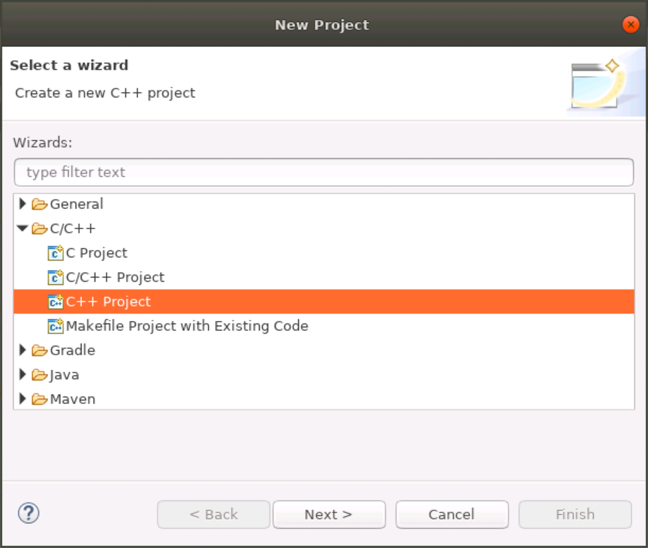 - Select the type of project you want to create. For this tutorial, expand the C/C++ folder, select C++ Project, and click the Next button.