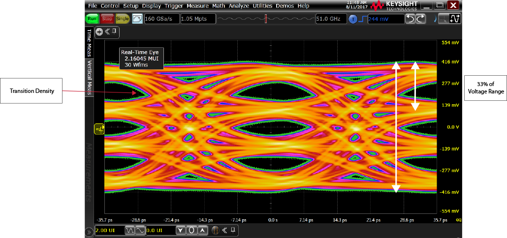 - Sampling Point: Finite rise times and different transition amplitudes create inherent ISI and make clock recovery more difficult. Consistent across all oscilloscope vendors, but quantization error plays a role when you take PAM4 measurements versus NRZ. Transition times of the PAM4 data signal can create significant horizontal eye closure due to higher transition density. The following figure shows the transition density.