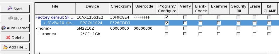 - Under Program/Configure column, select the respective devices. For example, 10AX115S1E2 and EPCQL1024.