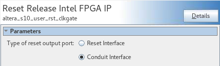 - In the parameter editor, under Type of reset output port, select Conduit Interface. Click Generate HDL and then click Generate.