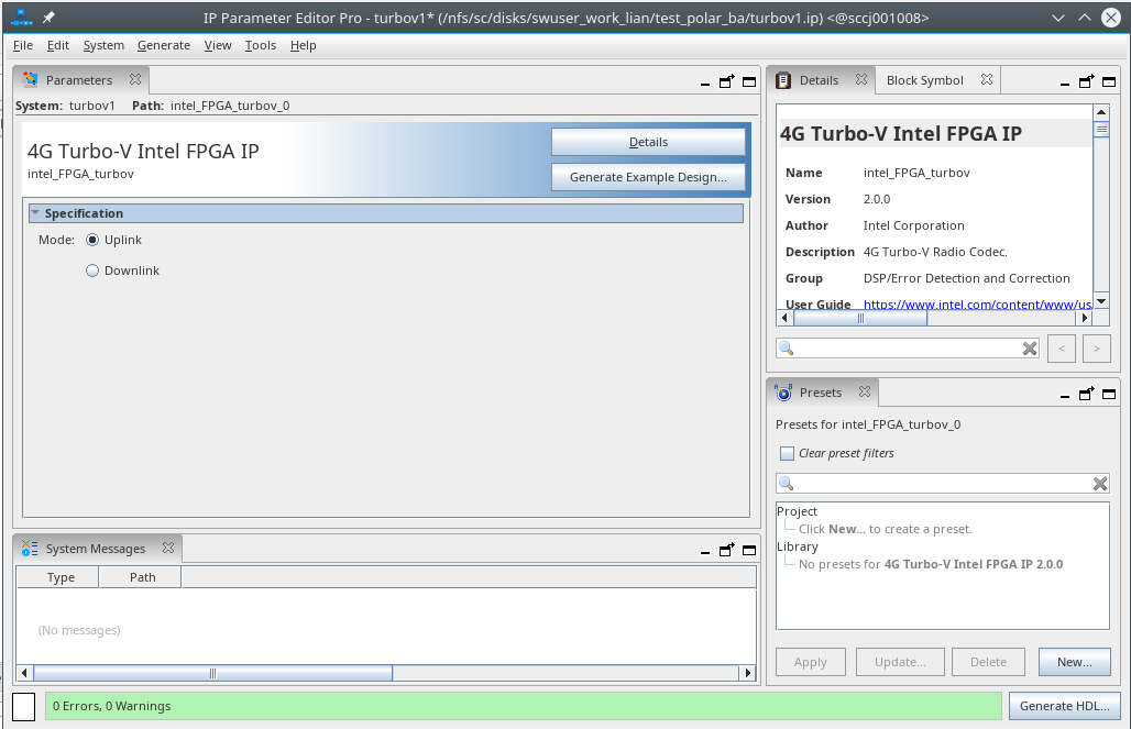 You can generate a downlink or uplink accelerator. To include the IP in a design, generate the IP in the Quartus® Prime software. Or optionally, you can generate a design example that includes the generated 4G Turbo-V IP, a C model, a MATLAB model, and simulation scripts. The software generates no hardware example in Generate Example Design.