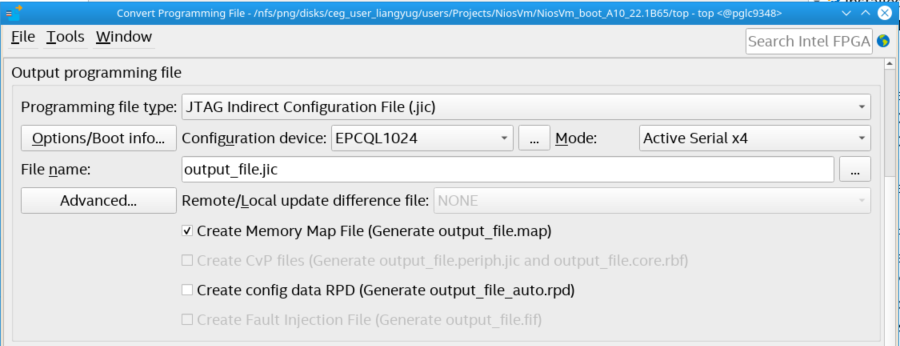 - For Programming file type, select JTAG Indirect Configuration File (.jic)