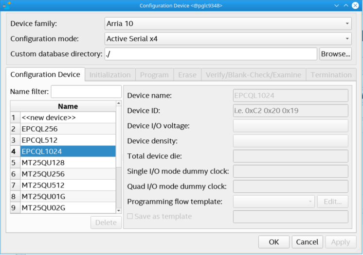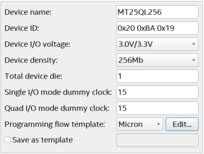 - Enter the information about Device name, Device ID, Device I/O voltage, Device density, Total device die, Dummy clock (Single I/O or Quad I/O mode) and Programming flow template.