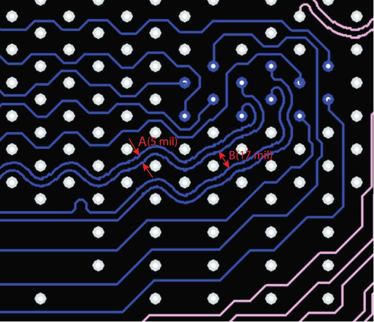 - Breakout (BO1/BO2) spacings have two different values in guideline tables. The first value represents minimum spacing between two signals routed as a pair (tightly coupled signals); this value is marked as A (5 mil) in the above figure. The second value represents minimum spacing between two pairs, and is marked as B (17 mil) in the above figure.