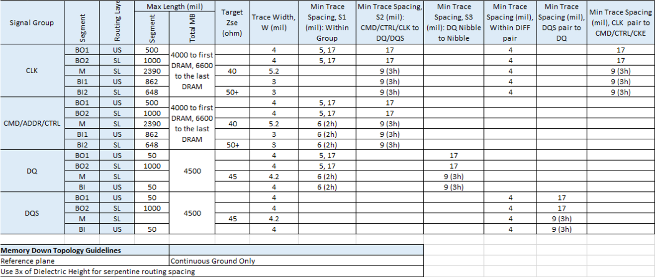 Reset signal routing also follows the CMD/ADD/CTRL routing design. Maintain an edge-to-edge space between the Reset signal and other signals on the same layer of at least 5x h. There is no requirement to have skew matching between the Reset signal and CLK signal.