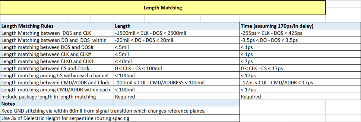 The following table provides a detailed skew matching guideline. Ensure that you include both PCB physical routing skew and package routing skew in your skew matching criteria. The physical length matching criteria in the table reflects the default stackup in our platform PCB design.