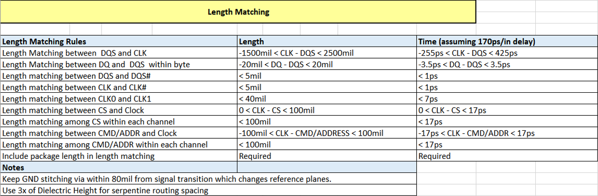 Reset signal routing design also follows the command, address, and control (CMD/ADD/CTRL) routing design. Maintain the space from the Reset signal to other signals on the same layer (edge to edge) at least 5x h. There is no requirement to have skew matching between Reset and CLK signals.