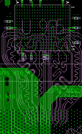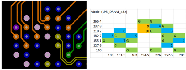 In addition, the following figure shows a LPDDR5 64-bit device board routing sample with pitch dimension of 0.4×0.4mm. The microvia has been used for via transitions on this interface. The microvia mentioned in the following is from top layer to layer 3, it belongs to Type-III stack-up for easier fan-out, not the same as microvia used in Type-IV stack-up. Only one lamination cycle is required, therefore the cost is not increased as much as microvias in Type-IV. You can also use normal PTH with backdrilling to fan out.