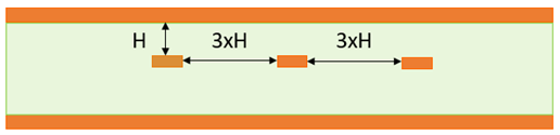 To minimize crosstalk horizontally between the signals on the same layer, PCB designers must maintain adequate signal trace-to-trace (edge to edge) space with a minimum spacing of 3 x H separation distance, where H is the dielectric thickness to the closest reference plane, as illustrated below. Some signals within the same group can have smaller spacing, such as DQ to DQ. Refer to the routing guideline sections for detailed spacing requirements for each signal group.