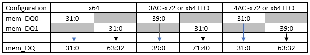 | x64 with ECC | 72 | 512b | 3 controllers used. ECC will be generated and checked by a soft IP block within the EMIF IP. |