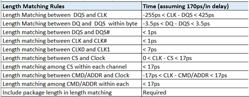 The following table provides a detailed skew matching guideline. Ensure that you include both PCB physical routing skew and package routing skew in your skew matching criteria. The physical length matching criteria in the table reflects the default stackup in our platform PCB design.