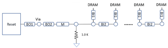 Reset signal routing also follows the CMD/ADD/CTRL routing design. Maintain an edge-to-edge space between the Reset signal and other signals on the same layer of at least 3x h. There is no requirement to have skew matching between the Reset signal and CLK signal. Altera recommends using a 1K-ohm pull-down resistor for Reset signal termination, as illustrated below.