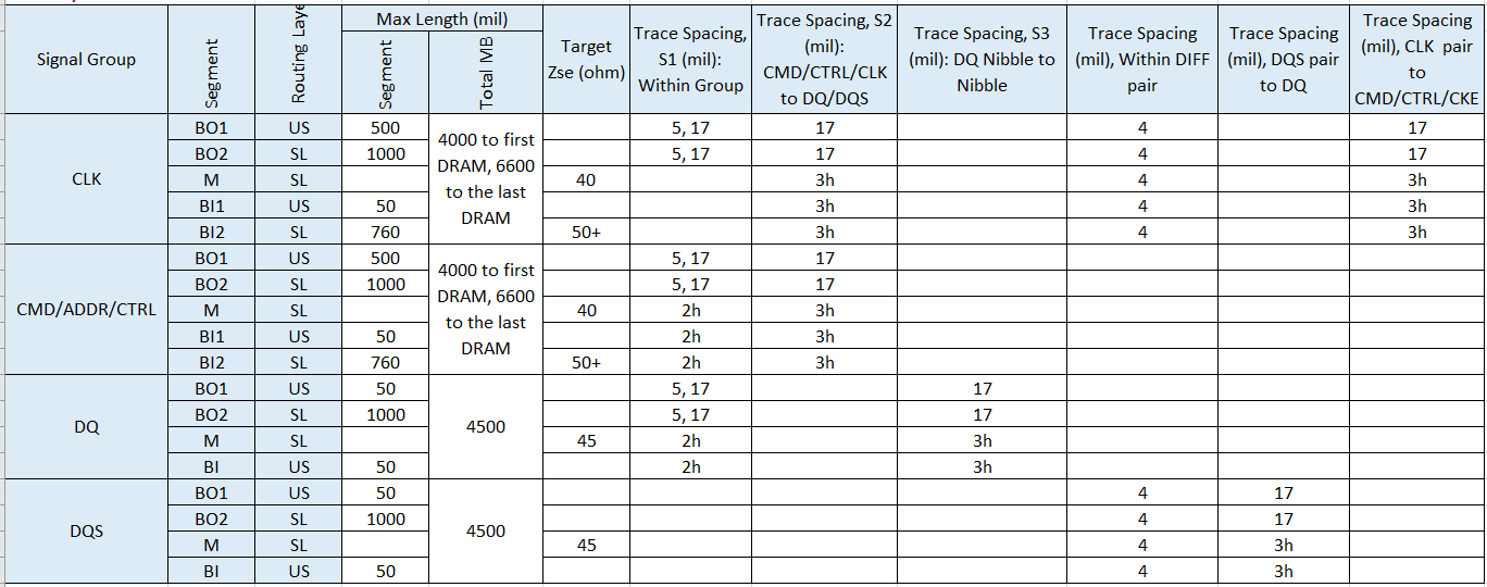 The following table shows physical trace segment routing guidelines, including the target impedance of routing for each signal and the minimum space between signal traces on the same layer. The PCB designer must meet the impedance target criteria. The h in the table indicates the minimum substrate height from signal layer to reference layer. Ensure that you follow the trace-to-trace-edge gap/space criteria in the guideline, based on h in various stackups.