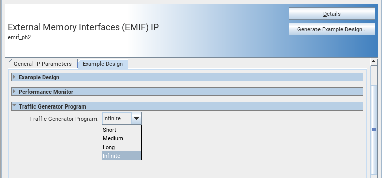 When you generate an Agilex™ 7 FPGA EMIF IP design example, you can specify the traffic pattern to run. Select the required setting, as illustrated in the figure below.