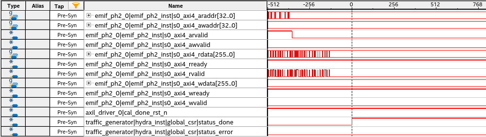 Note: For an infinite traffic pattern program, you will not see status_done=1, because the traffic continues running. Set the trigger conditions at the rising edge of the status_error signal and let the traffic run. Any failure in traffic is detected if the status_error signal goes high.