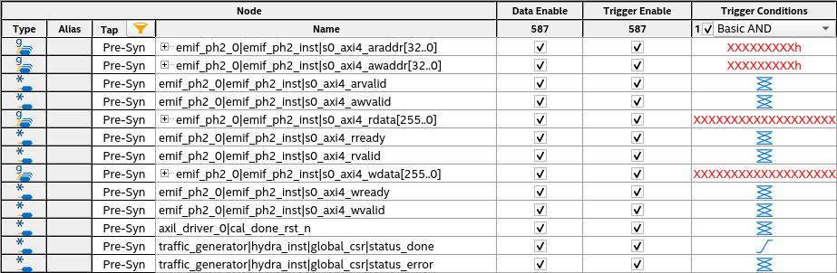 Note: The status_done and status_error ports on the traffic_generator|hydra_inst|global_csr instance are the traffic generator status signals. - Save and enable the Signal Tap file in the project, and recompile the design.