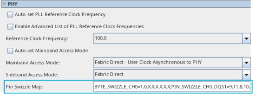 The Pin Swizzle Map allows you to inform the EMIF IP about the ordering of the physical connections of each DQ pin on the memory component to the FPGA. Incorrect information entered in the pin swizzle map may cause calibration errors.