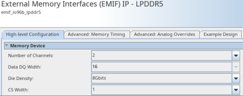 The example below shows memory parameterization based on the Agilex™ 7 FPGA M-Series Development Kit targeting an MT62F512M32D2 LPDDR5 EMIF configuration.