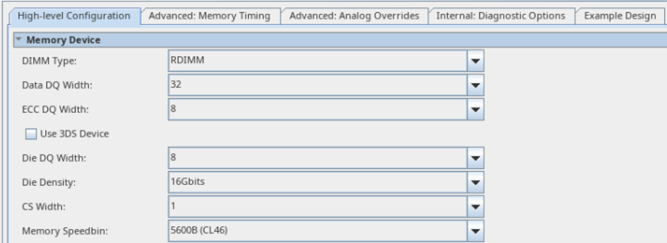 Verify that you select the correct memory Number of Channels, Data DQ Width, Die Density, and CS Width for the memory configuration used. Inaccurate information can result in calibration failure or traffic failure.
