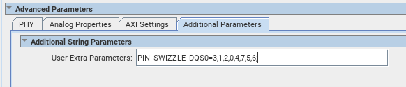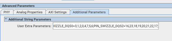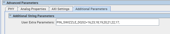 To achieve this swizzling in DQS Group 2, you must enter PIN_SWIZZLE_DQS2=16,23,18,19,20,21,22,17; in the User Extra Parameters field of the Additional Parameters tab in the Advanced Parameters section of the General IP Parameters tab in the External Memory Interfaces IP parameter editor.