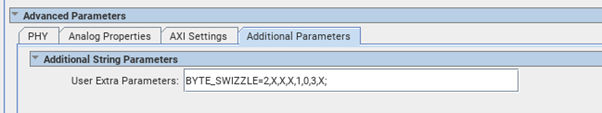 To achieve this swizzling, you must enter BYTE_SWIZZLE=2,X,X,X,1,0,3,X”; in the User Extra Parameters field of the Additional Parameters tab in the Advanced Parameters section of the General IP Parameters tab in the External Memory Interfaces IP parameter editor.