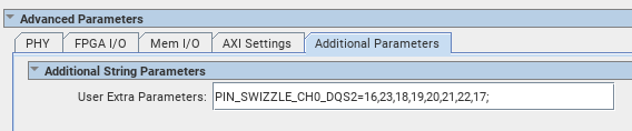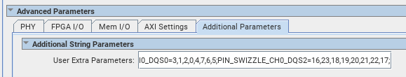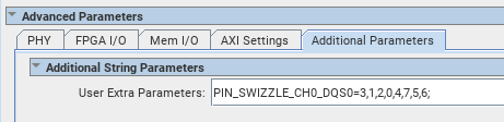 To achieve this swizzling in DQS Group 2, you must enter PIN_SWIZZLE_CH0_DQS2=16,23,18,19,20,21,22,17; in the User Extra Parameters field of the Additional Parameters tab in the Advanced Parameters section of the General IP Parameters tab in the External Memory Interfaces IP parameter editor.